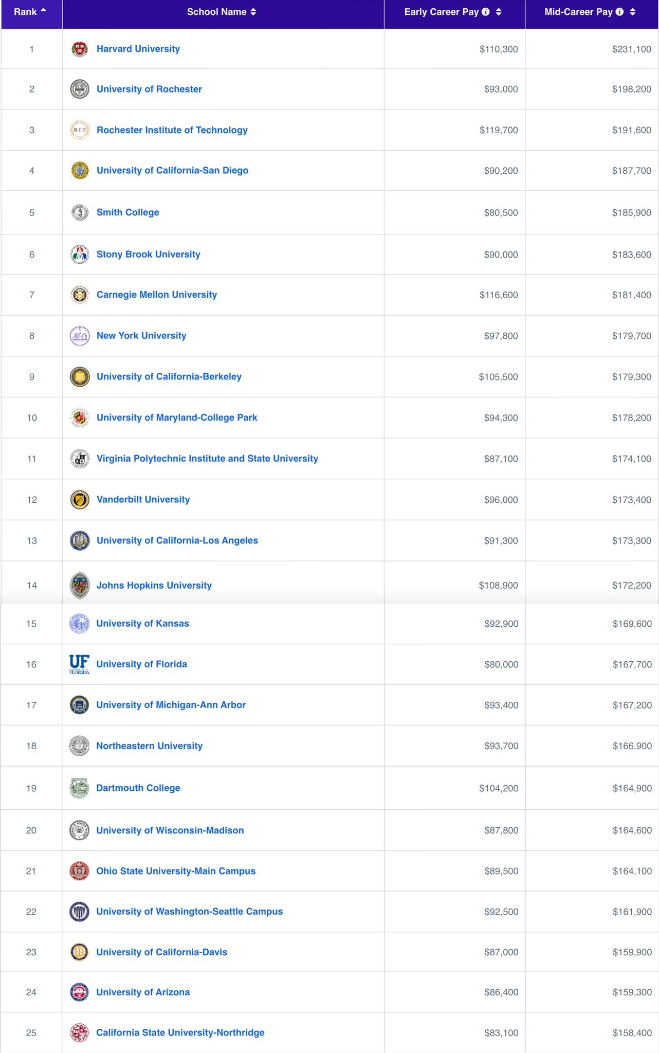 数学专业也一直是很多留学生会考虑以及选择的专业,此份榜单中,哈佛大学拿下第一名的位置,早期年薪就达到了$110,300,中期年薪达到了$231,100。