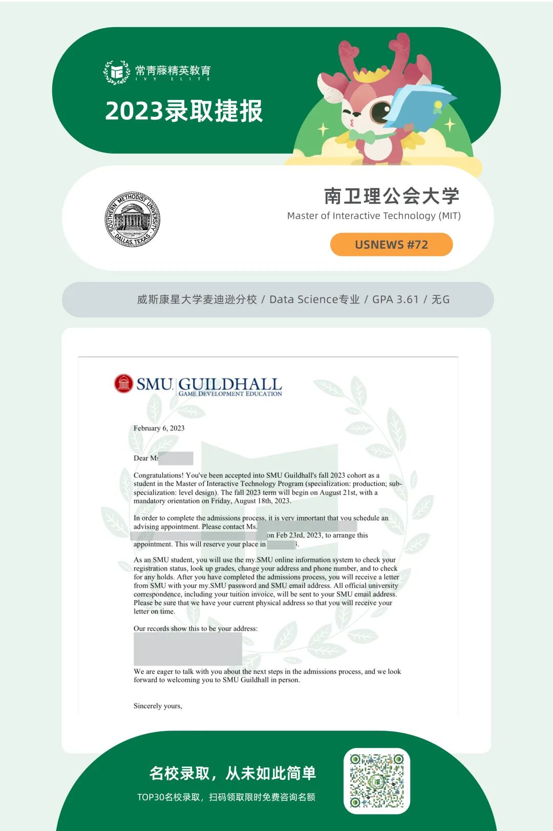 录取院校:中佛罗里达大学、南加州大学、东北大学、南卫理公会大学