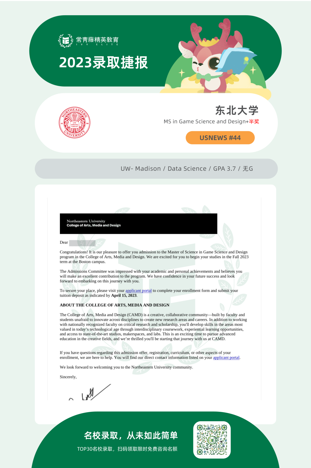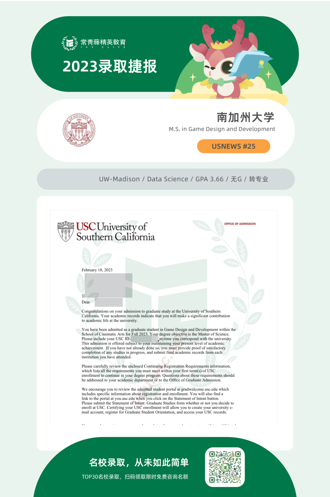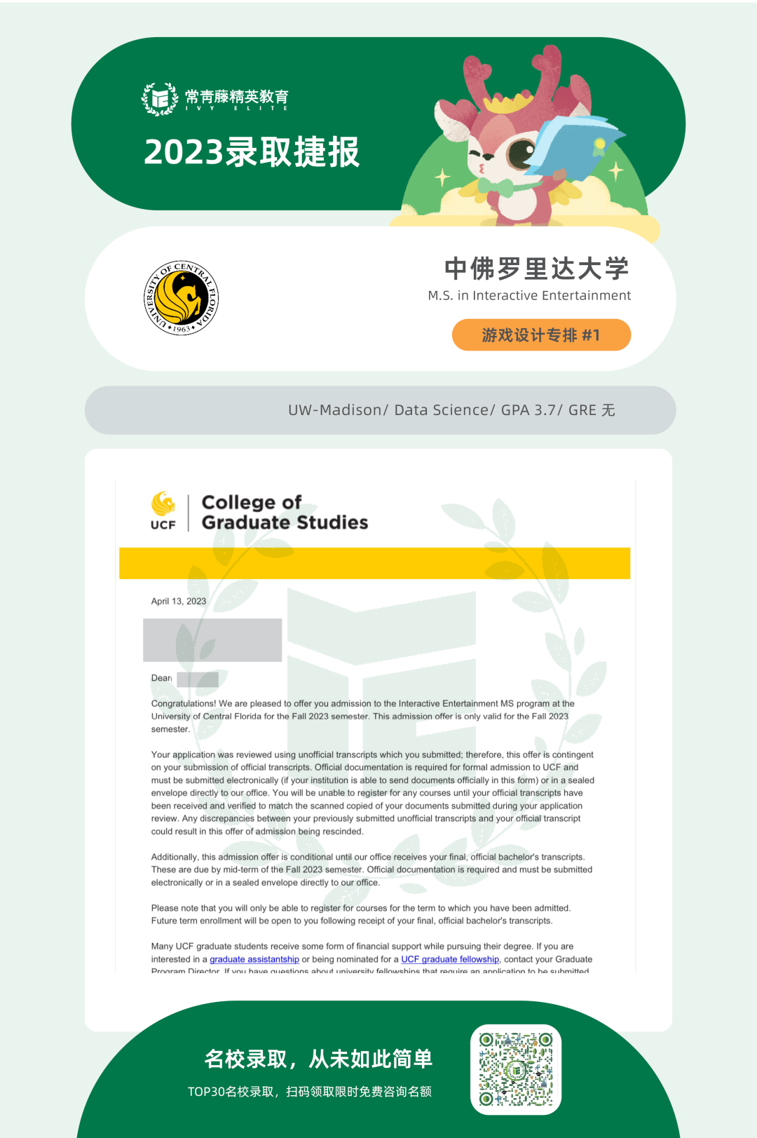 现在C同学已经收到了全球专排TOP1的UCF Interactive Entertainment、南加大Game Design and Development、东北大学 Game Science and Design半奖、南卫理公会大学Interactive Technology的录取,让我们一起期待C同学在游戏设计方向大放异彩把!