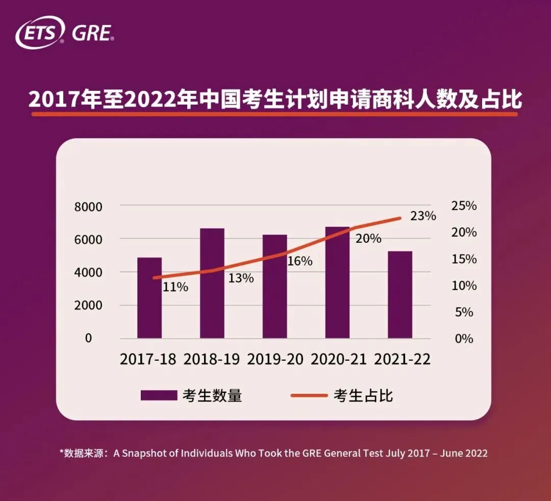 在考生数量受疫情影响略有下降的情况下,计划攻读商科的考生比例在不断增长。
