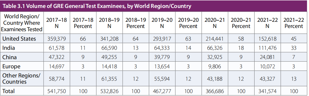 2021年7月-2022年6月,全球约有341574名考生参加GRE考试,世界前三大考生来源国分别为:美国、印度和中国。