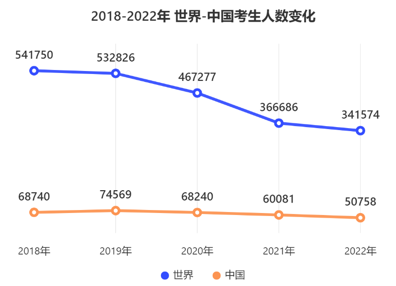 从数据中可以看出,2022年中国大陆GRE考生人数远小于世界考生人数下降幅度。