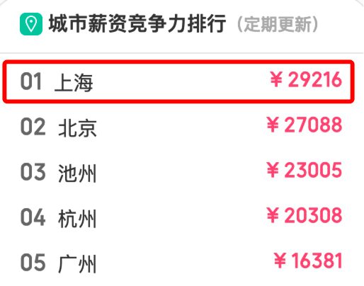 求职时的影响因素的确有很多,但最让人无法拒绝的可能就是高薪了吧!从城市薪资竞争力排行可以看出上海居于全国首位,所以想找到高薪的工作也是相对容易的。
