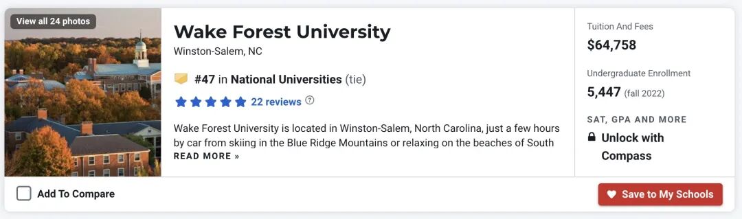 今年最牛的当属加州系大学,直接逆天翻盘。UCB和UCLA携手前进5名位列Top15,UCD狂升10名排名第28名,UCSD紧随其后并列第28名一起进入Top30。而常年Top30的NYU和维克森林大学今年排名下降明显,掉出前三十,分别位列第35和第47名。