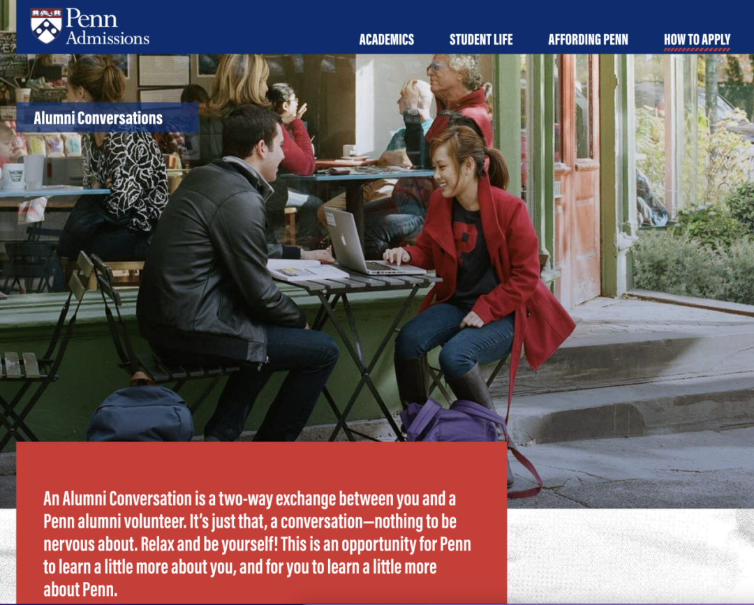“校友对话是您和宾夕法尼亚大学校友志愿者之间的双向交流。只是一次谈话——没什么可紧张的。放松并做你自己!”