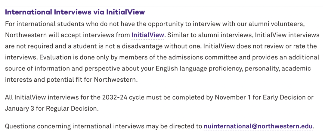 然而,杜克和西北大学在其官方网站上强烈建议国际学生申请者使用InitialView面试,这背后透露出另一种微妙的立场:他们默许了国际学生可以通过第三方面试机构来替代官方面试。