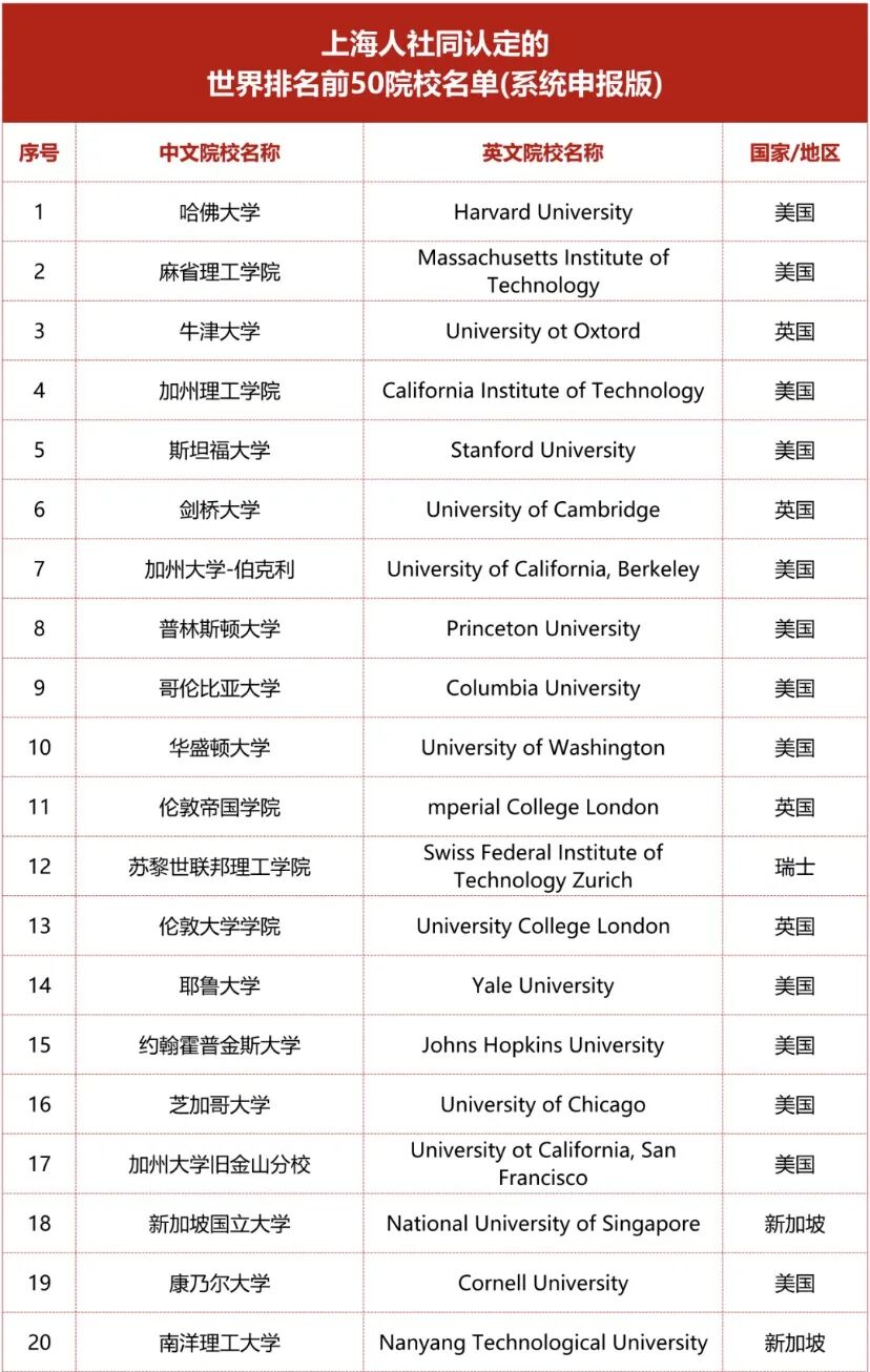高校范围参照上海市留学回国人员可直接办理落户的高校名单,即上海人社局认可的世界TOP50院校,这部分学生“进体制与落户”两不误!