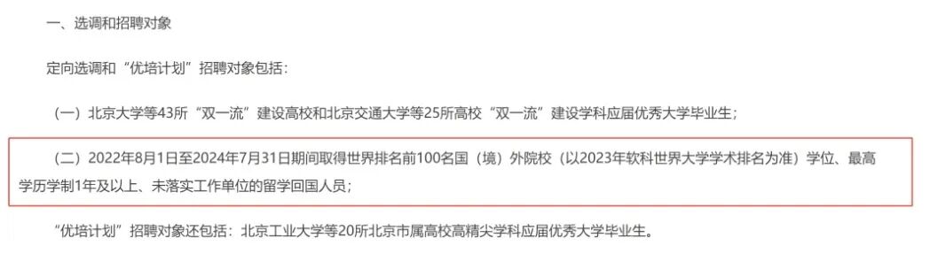 2024年北京面向海外院校定向选调所划定的院校范围,是软科世界大学学术排名榜前100名,而软科侧重衡量高校的研究实力,重视论文和尖端科技,几乎所有指标都是量化的,没有评估因素。因此,在这份排名上,理工类学校更占优势。