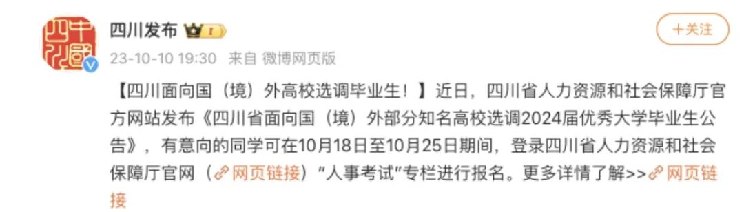 10月,四川发布面向国(境)外部分知名高校选调2024届优秀大学毕业生公告,共有54所境外院校入围。