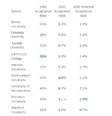 1992年,美国这些最精英的大学本科的平均录取率超过27%。而到了2021年,这个数字已经下滑到6%。根据预测,30年之后,美国最精英的大学录取率会在1%-2%之间。数据预测得出的录取率平均是1.5%。其中,斯坦福大学0.7%,普林斯顿和耶鲁1%,西北和宾大1.1%,哥大1.2%……
