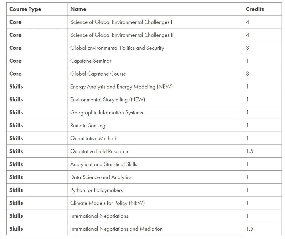 全球环境挑战科学 I 和 II:这两门课程涵盖了全球环境的科学背景和相关挑战,为学生提供必要的知识基础。