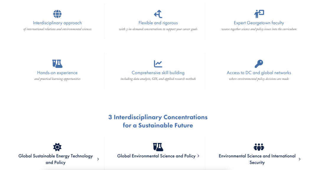 乔治城大学环境与国际事务理学硕士 (MS-EIA) 由沃尔什外交学院和乔治城地球共享研究所共同开设,专为雄心勃勃的学生而设计,将跨学科专业知识、实践技能和进入国家首都有影响力的机构的机会结合起来。