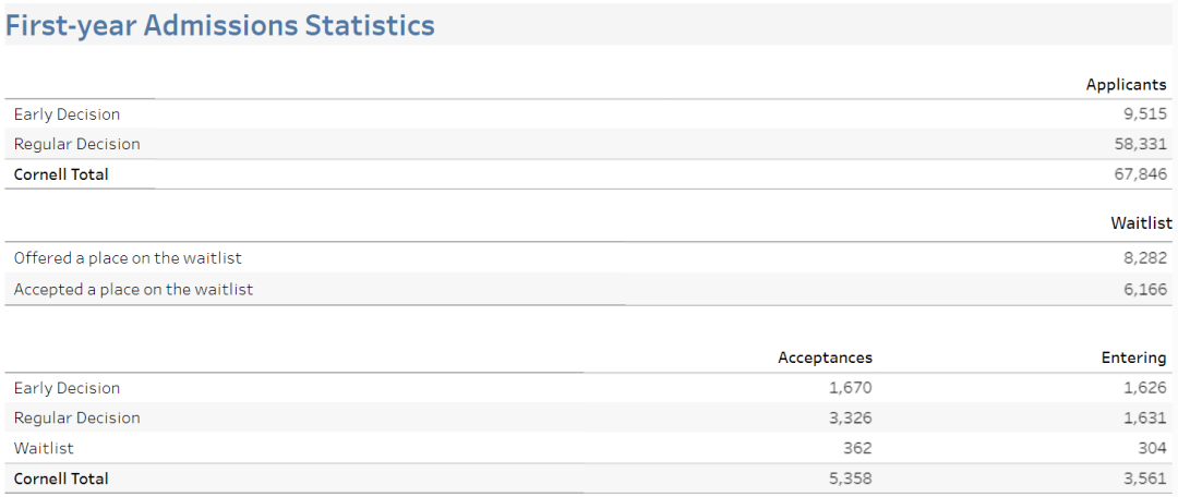 根据官方消息,康奈尔大学在2023 Fall早申阶段和常规申请阶段一共收到67,846份入学申请,录取了5,358名新生,相比去年有所增加,总录取率约7.9%。