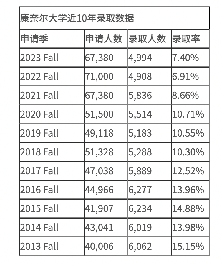 尽管 2023 年秋季的录取率有所回升,但总体录取率仍然未超过 8%。根据这一趋势,康奈尔被冠以“最容易进的藤校”的头衔很可能会不再成立!