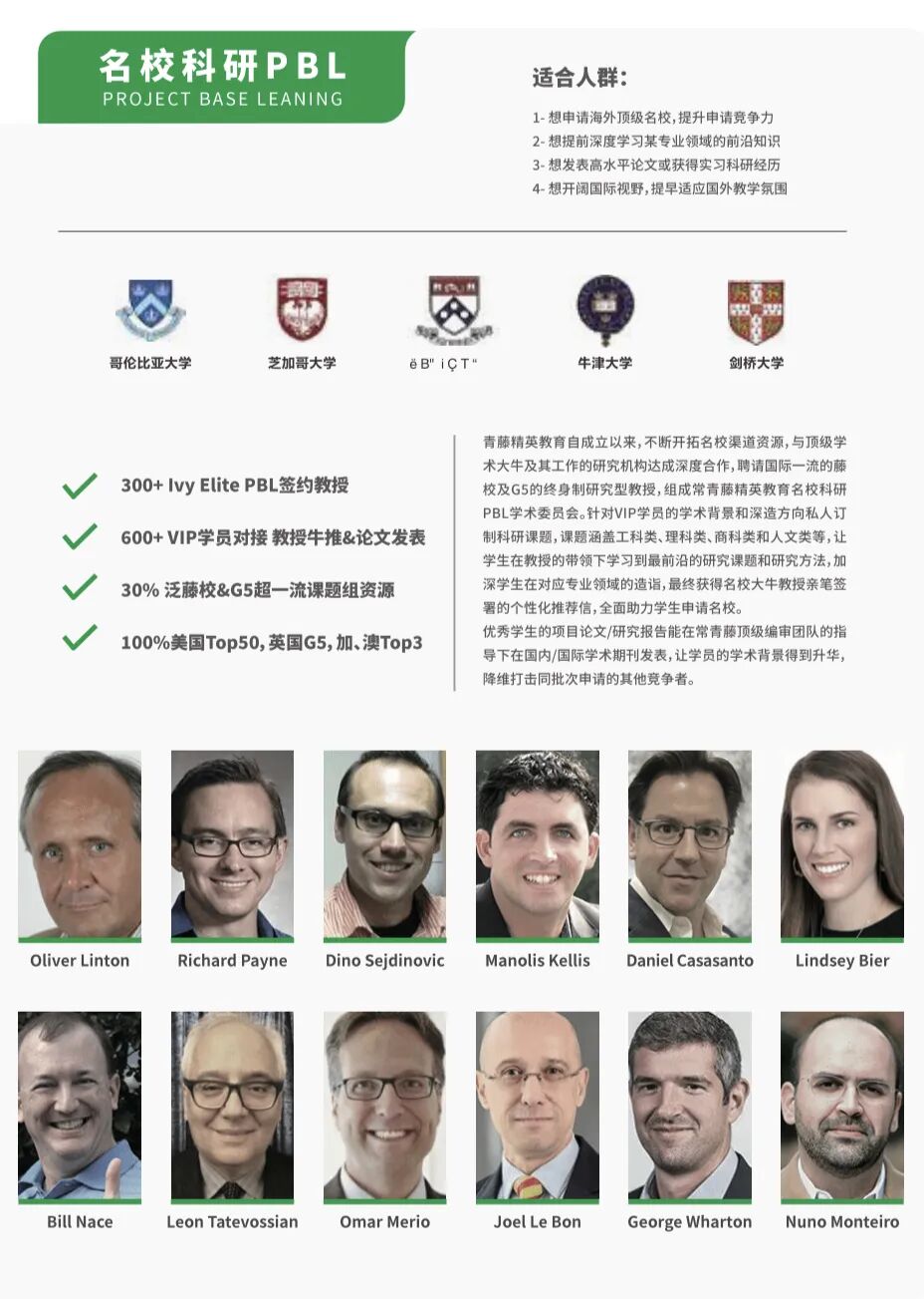 与众多世界五百强企业深度合作,开展线上线下多元化名企实习项目;网罗近千名高校教授开发出名校科研PBL并组成明星编审团队,业内首推国际期刊直通车服务