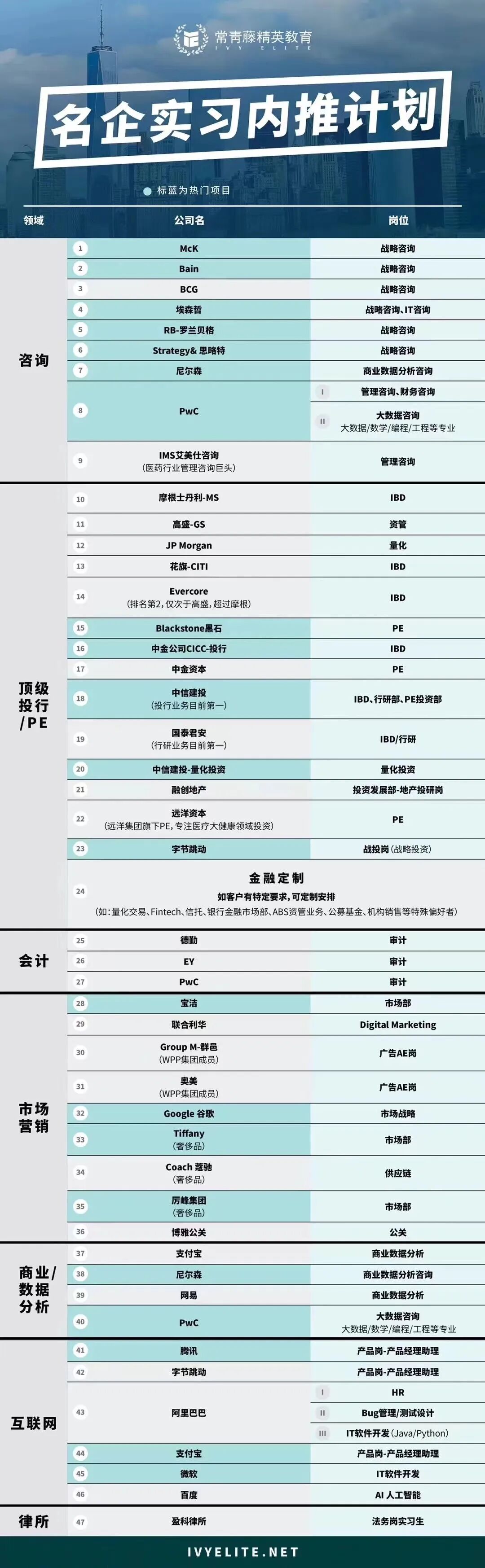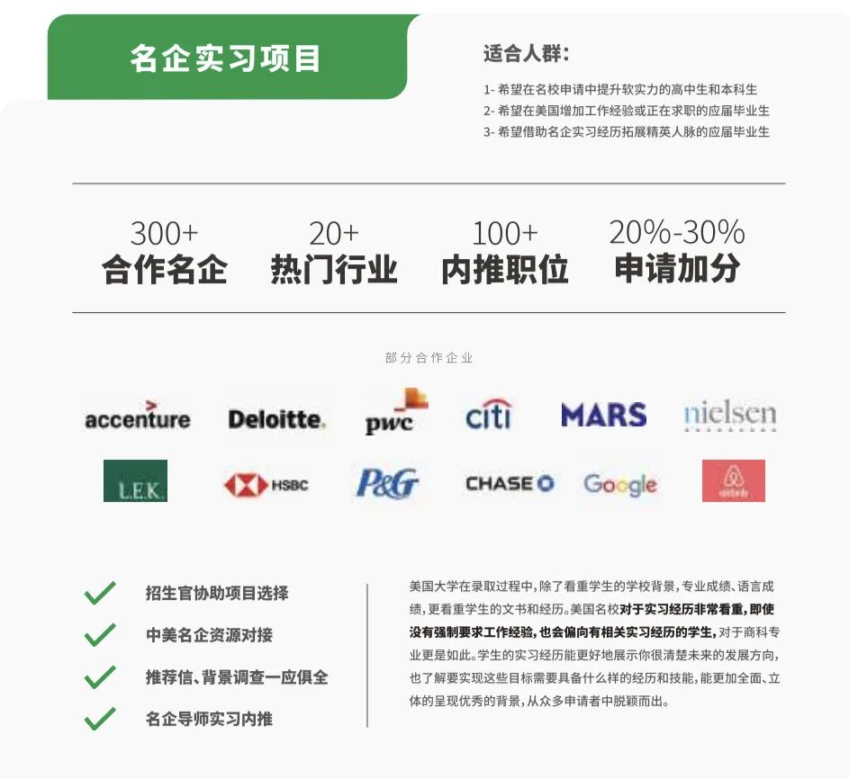 常青藤精英教育与部分世界五百强企业在职人士建立合作内推机制,将优质的实践资源与学生具体情况相匹配。