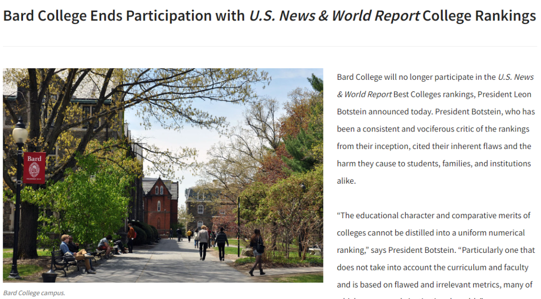 值得注意的是,早在今年2月,科罗拉多学院就宣布不再参与U.S. News的本科生排名,而巴德学院也紧随其后表示不再参与U.S. News的本科文理学院排名。