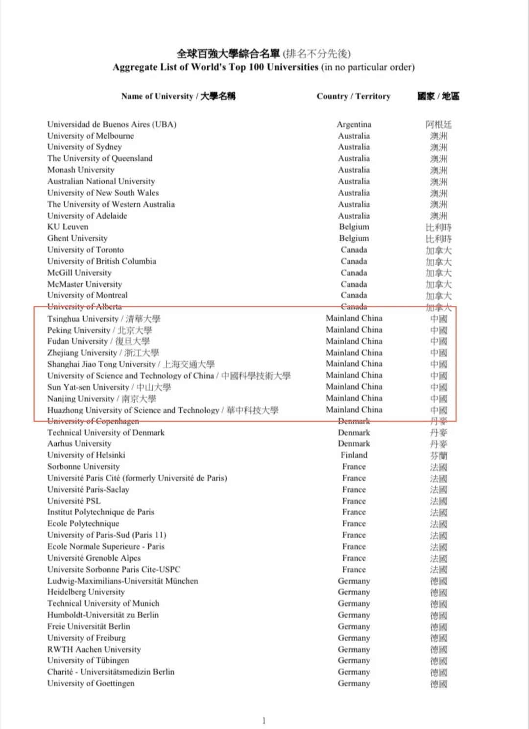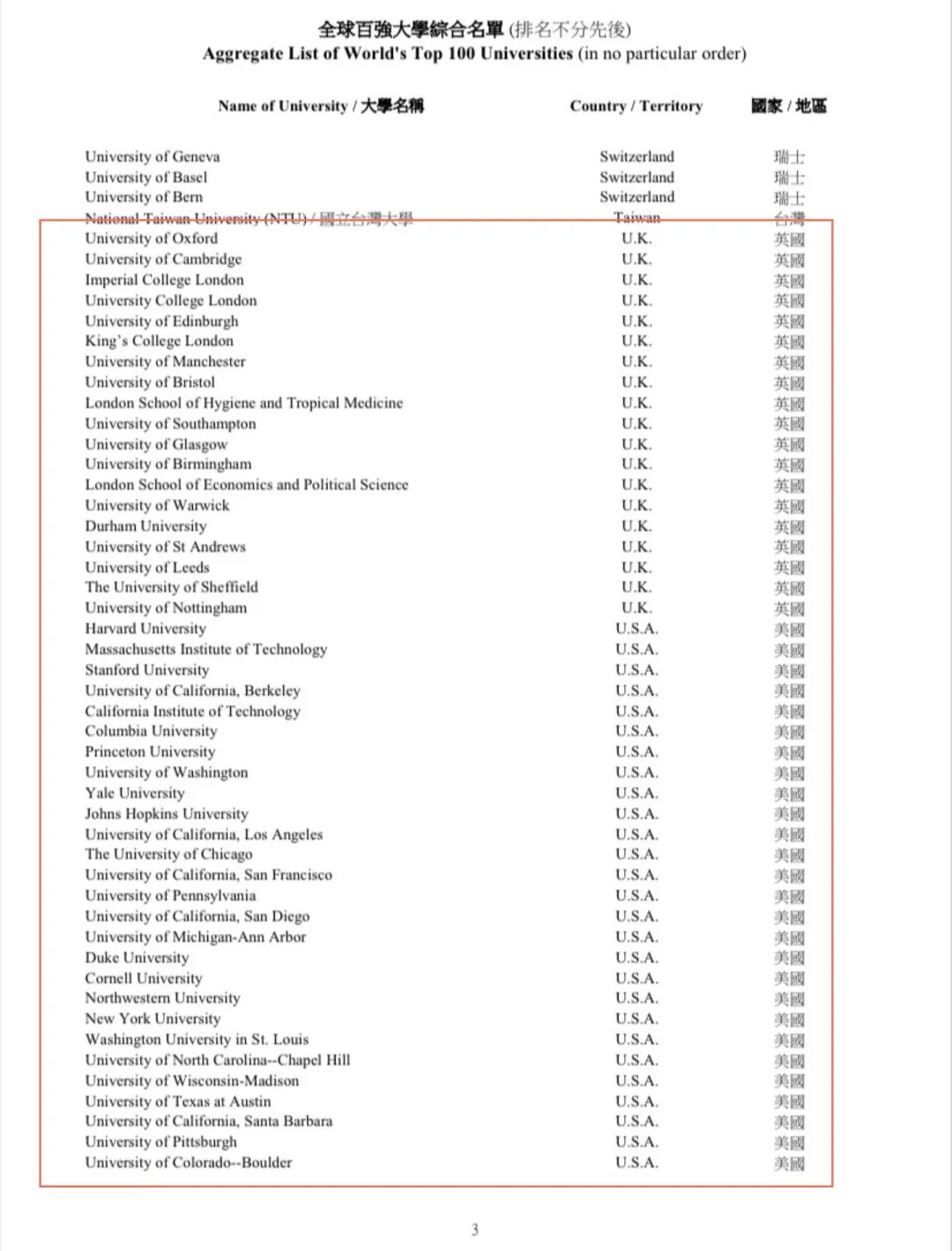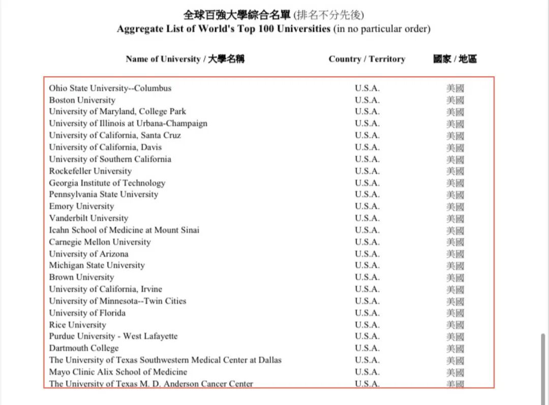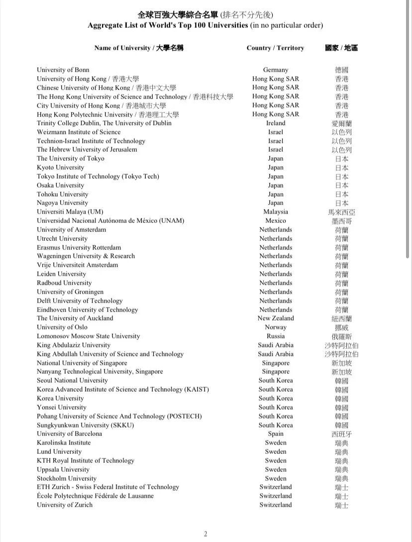 申请人可按此浏览最新的「全球百强大学综合名单」。