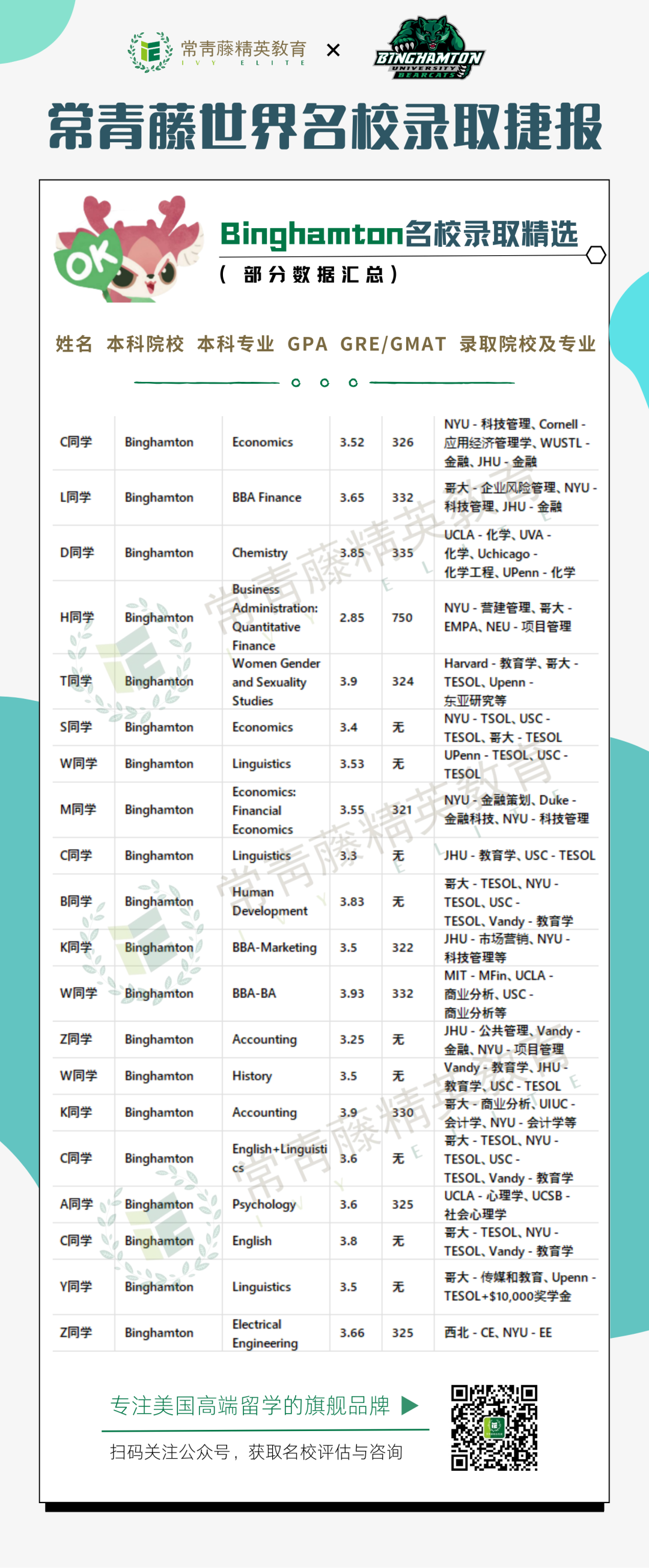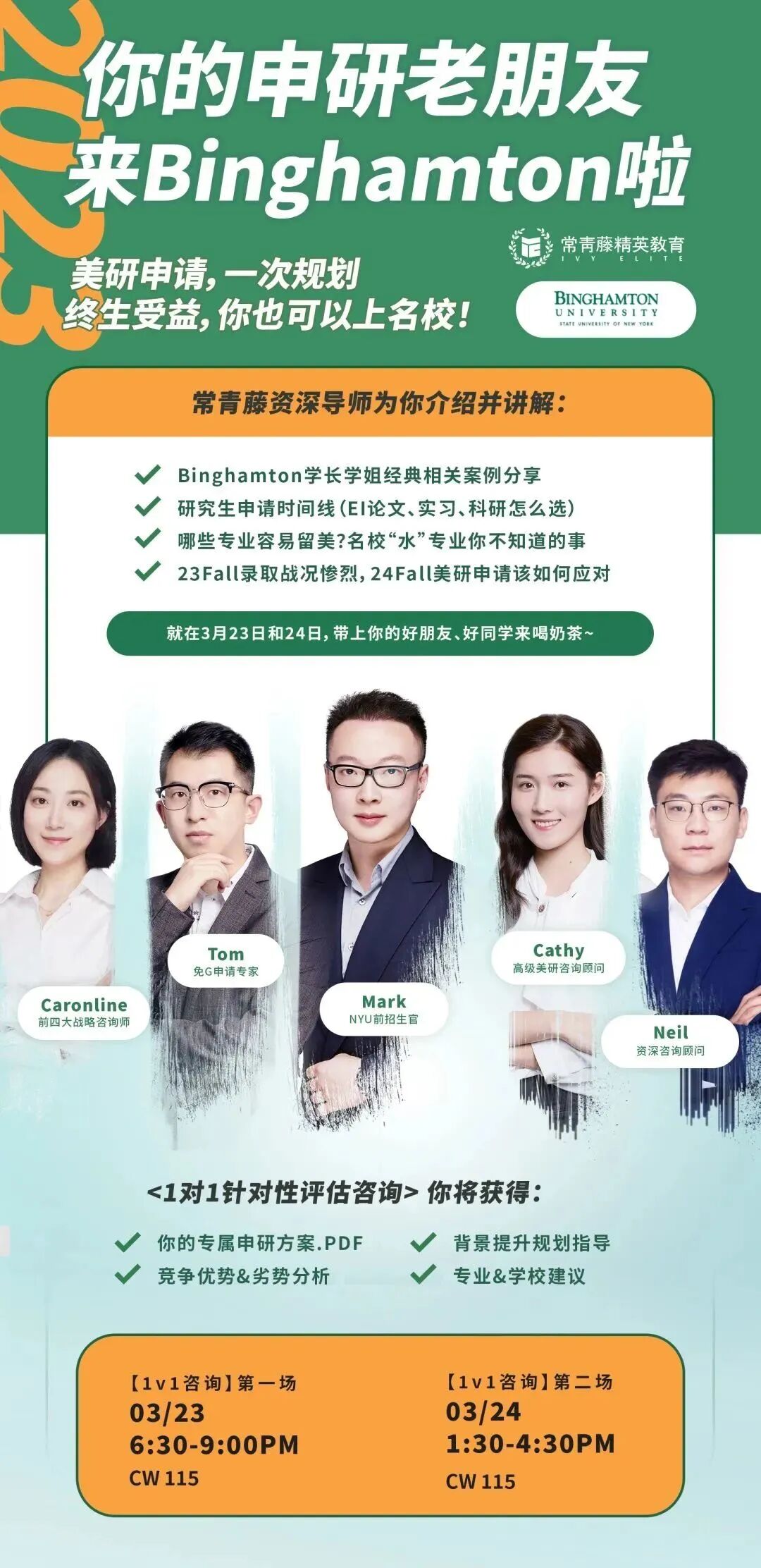 因此常青藤集合各位留学名师为Binghamton同学们带来珍贵的专家免费1对1申研咨询机会!用十年留学经验、数据案例和内部消息弥补你的信息差、获得最准确的信息!👇👇👇