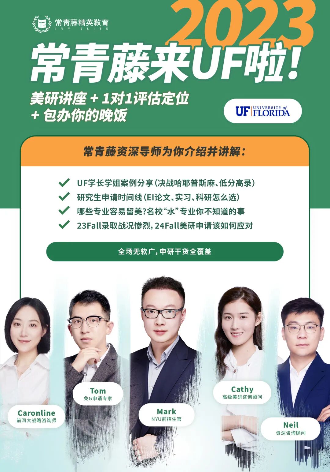 因此常青藤集合各位留学名师为UF同学们带来招生官讲座分享+专家免费1对1申研咨询机会!用十年留学经验、数据案例和内部消息弥补你的信息差、获得最准确的信息!👇👇👇
