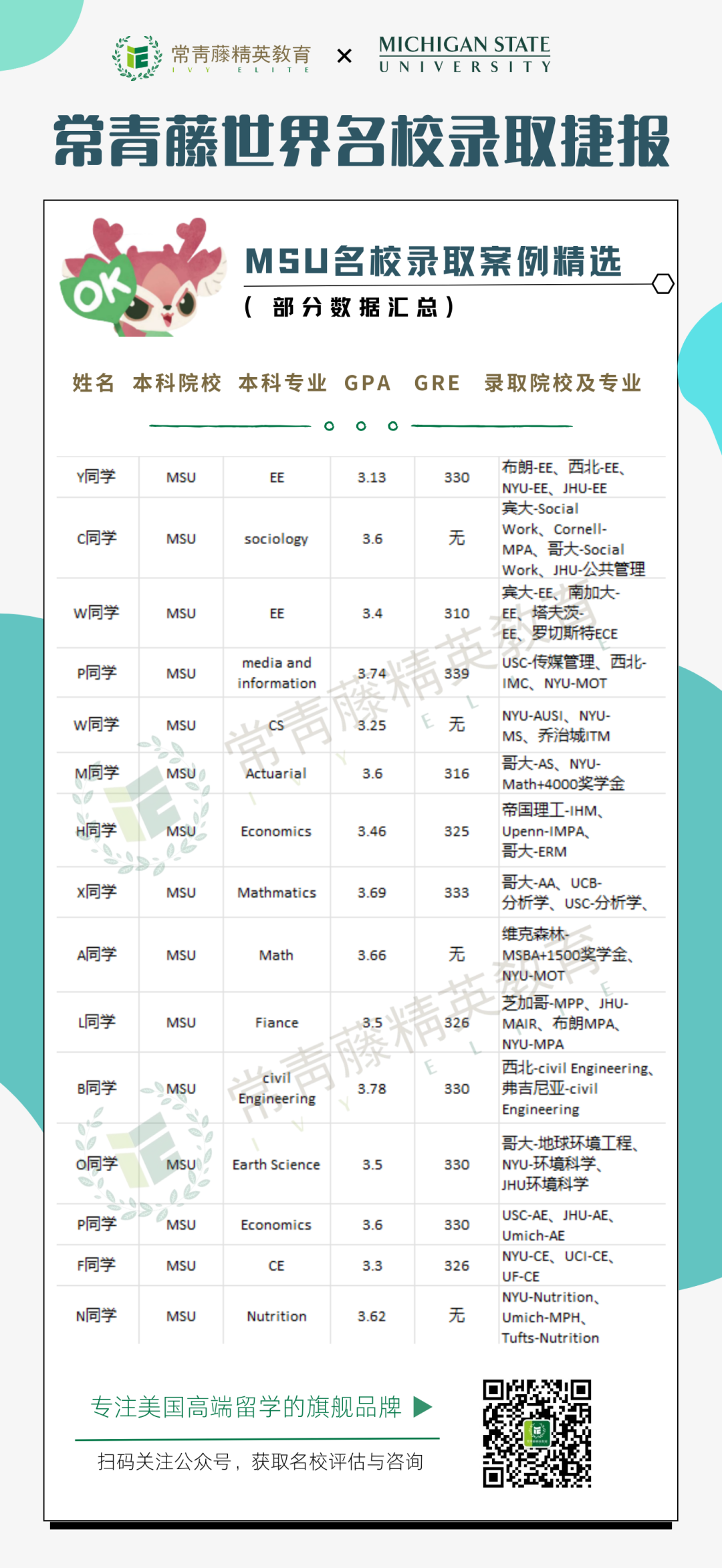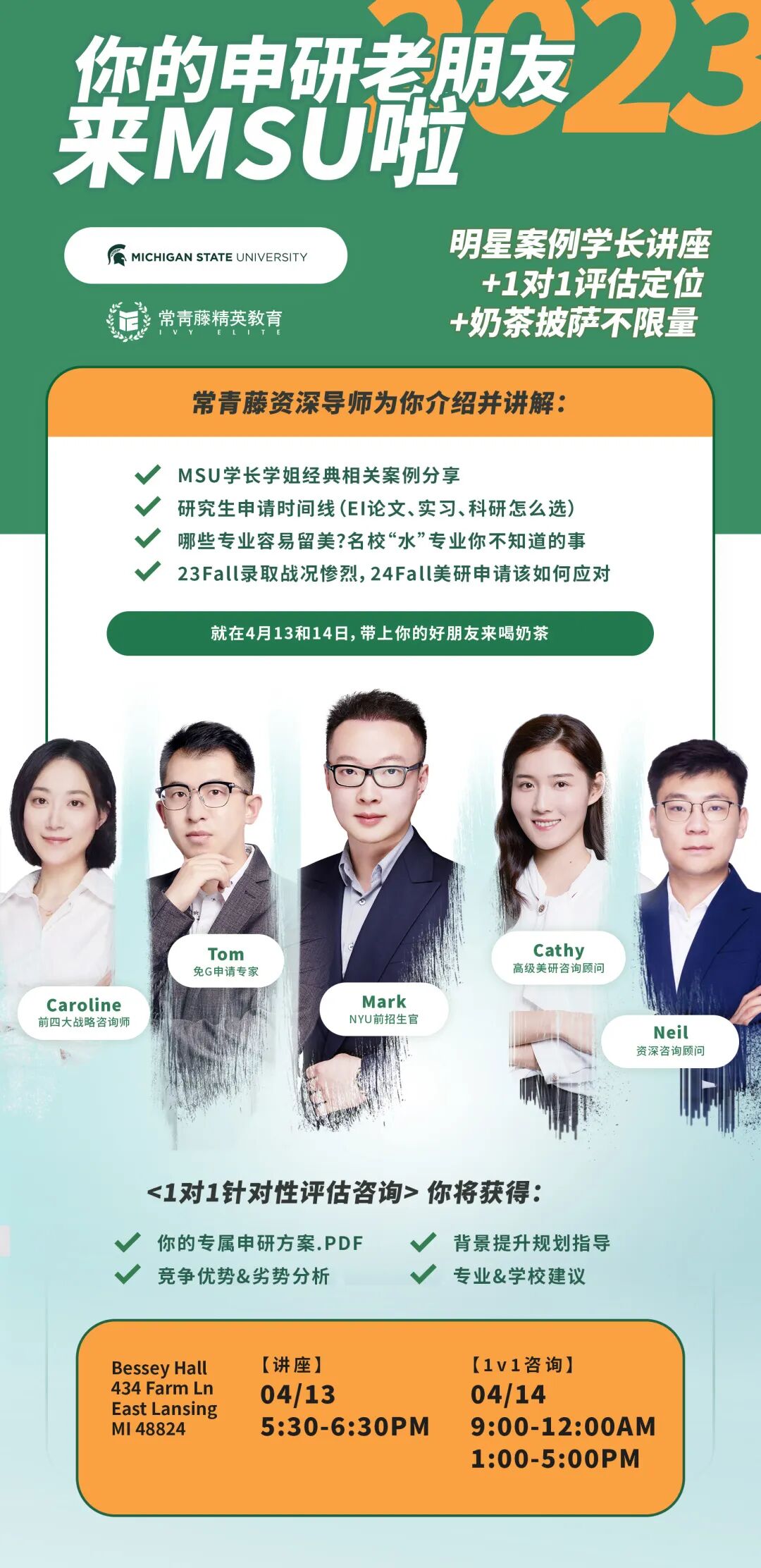 因此常青藤集合各位留学名师为MSU同学们带来明星学员讲座分享+专家免费1对1申研咨询机会!用十年留学经验、数据案例和内部消息弥补你的信息差、获得最准确的信息!
