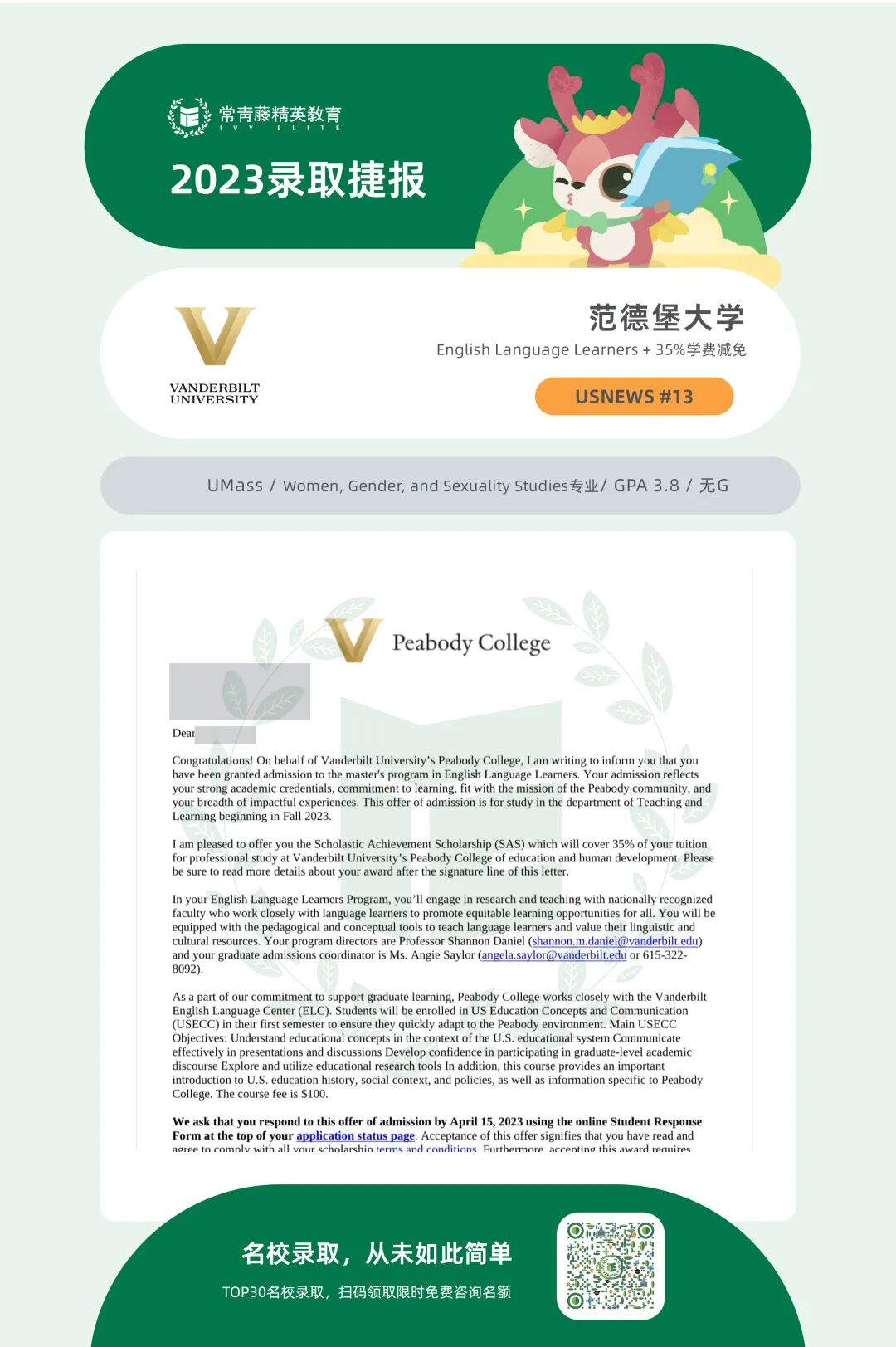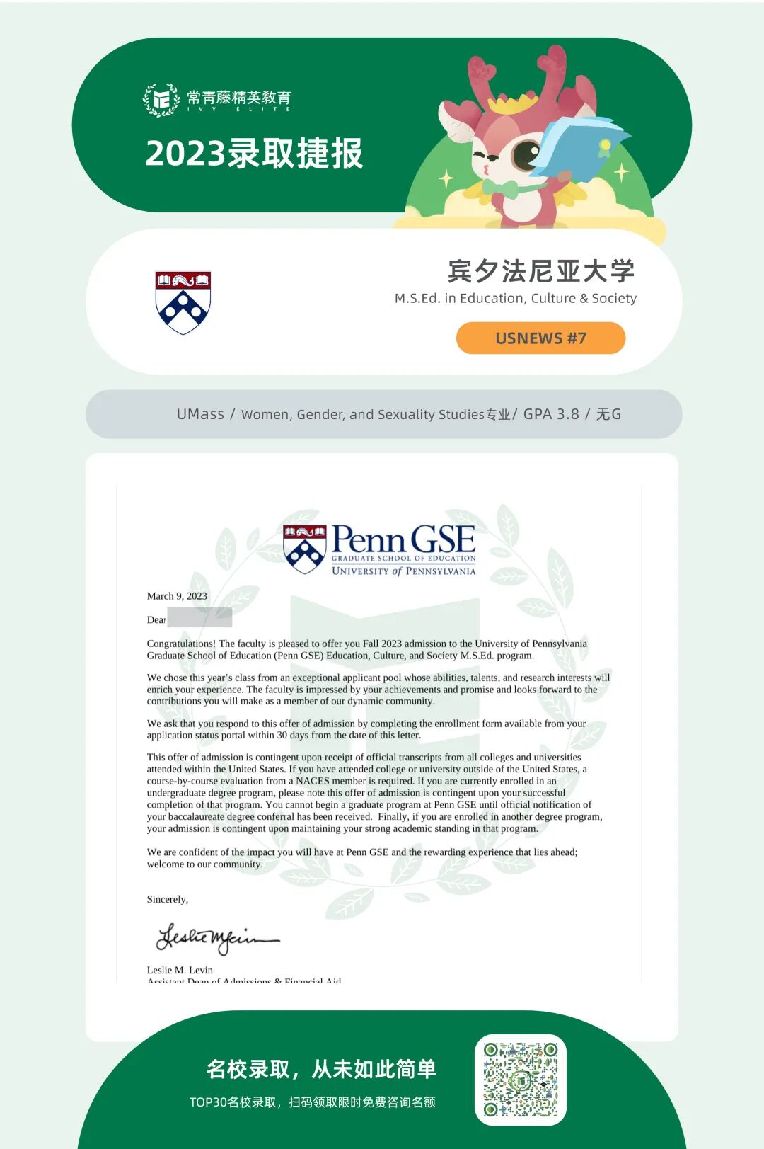 小张来自University of Massachusetts Amherst,在美国的本科学校里算是中规中矩的水平,学的是Women, Gender, and Sexuality Studies,专业本身比较抽象,类似于社会学+教育学的范畴,未来申请研究生既可以往社会学走、也可以往教育学走。学生个人是偏向直接申请社会学博士的,但是常青藤的导师们在深入了解后发现小张本身没有科研背景,也没有和教授发表过任何期刊或者paper,所以申请博士的竞争力不太强;加上父母是在高校里工作的缘故,期望孩子可以申请教育方向,未来如果回国进入高校也会是不错的选择。