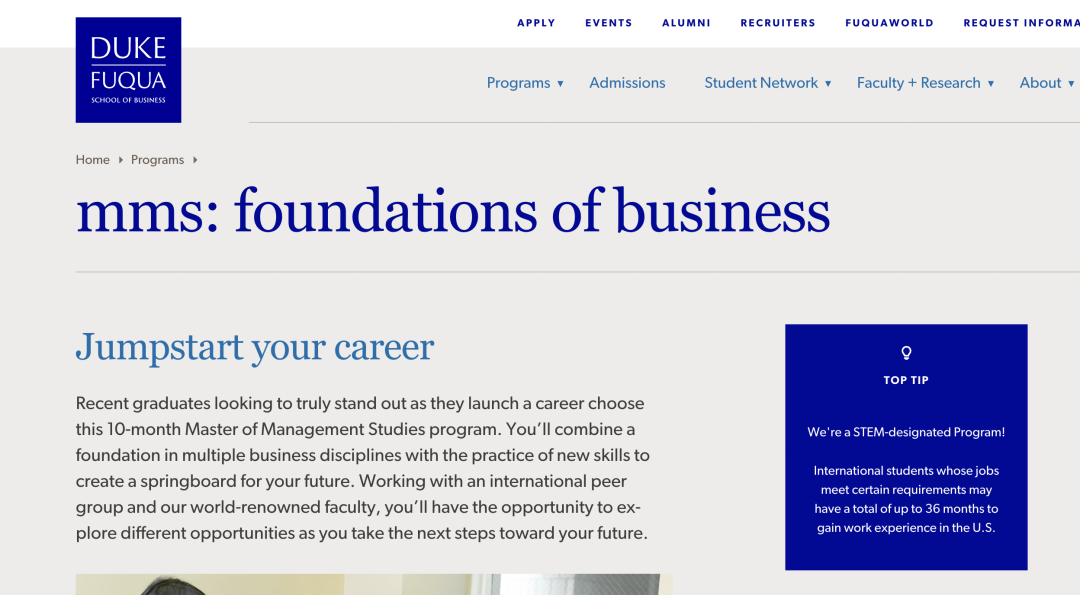 杜克大学管理学项目开设在商学院下,全日制为期10个月,每年7月开学,属于STEM项目。项目课程涵盖了商务的所有基础,培养学生的专业能力以及分析,批判想思维,沟通和领导技能。